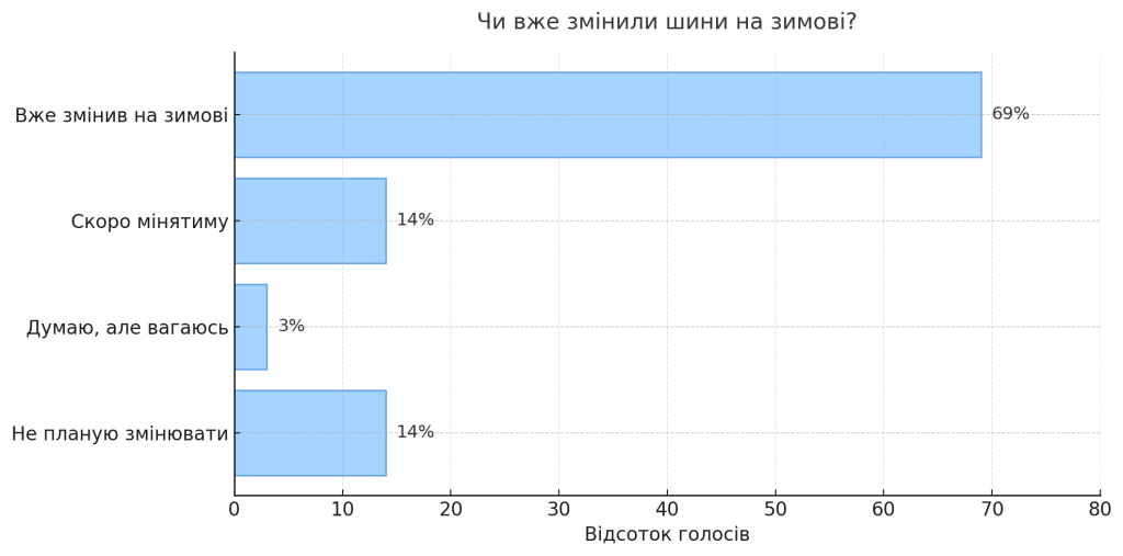 Найбільше голосів — 69% учасників — зазначили, що вже використовують зимові шини та підготували авто до зимових доріг.