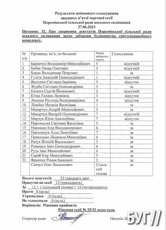 На 25 черговій сесії Поромівської сільської ради виносилось питання “Про звернення депутатів Поромівської сільської ради восьмого скликання щодо заборони будівництва сміттєпереробного комплексу”. Із 22 зареєстрованих депутатів за заборону будівництва проголосували 13 депутатів та міський голова (разом 14 голосів). Дев’ять обранців громади були відсутні.