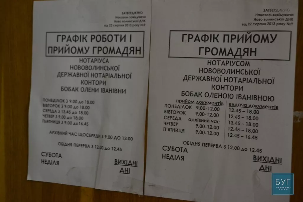 Журналісти БУГу навідалися до кабінету державного нотаріуса, якого у четвер, в робочий день о 10 годині ранку не було на місці (хоча початок робочого дня – з 9 ранку).