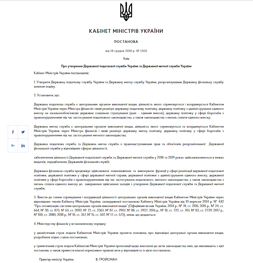 Прем’єр-міністр України Володимир Гройсман підписав постанову про реорганізацію Державної фіскальної служби України шляхом поділу на Державну податкову і Державну митну служби.