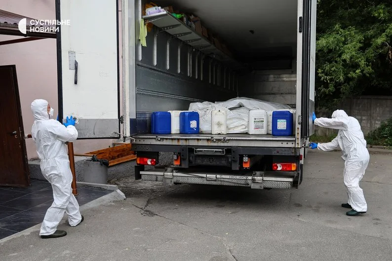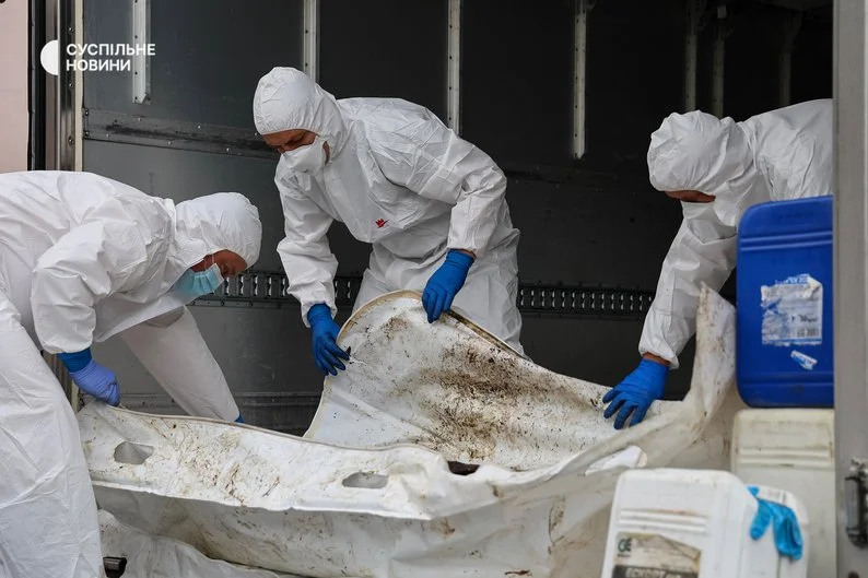Білий фургон-рефрижератор заїжджає на територію моргу. Військовослужбовці, які працюють із бюро судмедекспертизи, натягують на себе білі захисні костюми, одягають респіратори, гумові черевики і блакитні рукавички.
