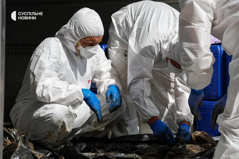 Всередині білого пакета ― чорний, а вже в ньому рештки. Це піксельна форма впереміш із землею та плоттю, кістки, відокремлені фрагменти тіла, взуття. Слідчі фотографують усе, особливо звертаючи увагу на те, чи немає в пакеті індивідуальних речей. Вони допоможуть визначити, кому належать рештки.
