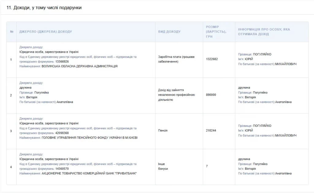 Колишній голова Волинської ОДА Юрій Погуляйко після звільнення у 2024 році подав декларацію, в якій вказав значне зростання фінансових активів. Він отримав понад 200 тисяч гривень пенсії, 336 тисяч гривень виплат при звільненні, а його сімейні заощадження зросли у рази.