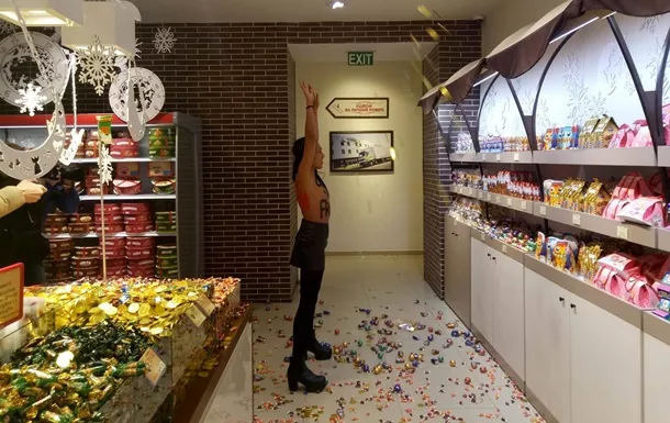 Відзначається, що дівчина увірвалася в магазин з оголеними грудьми з написами “Black Friday, Sale Roshen!” Вона розкидала цукерки та жбурляла торти.