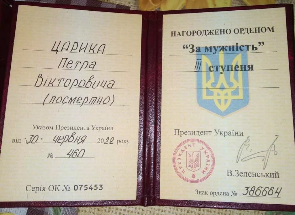“За особисту мужність і самовіддані дії, виявлені у захисті державного суверенітету й територіальної цілісності України, вірність військовій присязі, відповідно до Указу Президента України £ 460 від 30-го червня 2022 року, Петра Царика нагороджено орденом «За мужність» ІІІ ступеня, посмертно”, – йдеться у дописі.