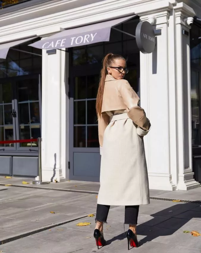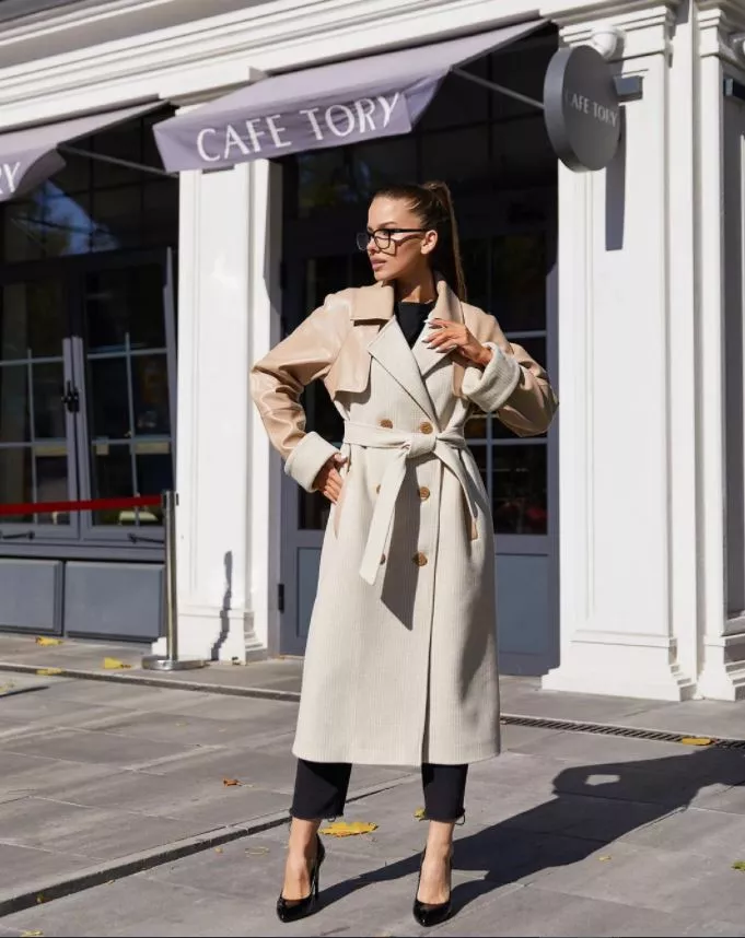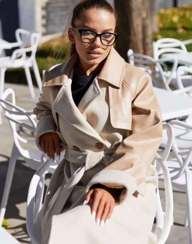 Для стильного луку пригляньте двобортне пальто-тренч із бежевою клітинкою та цікавим акцентом – оздобленням із еко-шкіри. Носити його можна з класичними брючними костюмами і туфлями-човниками або із широкими джинсами і зручними кросівками. Доповніть образ відповідними аксесуарами.