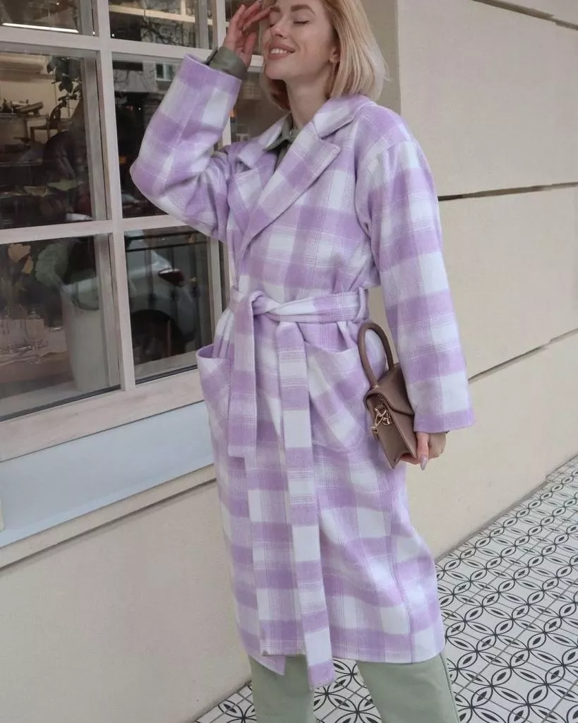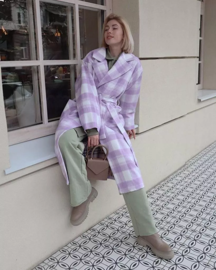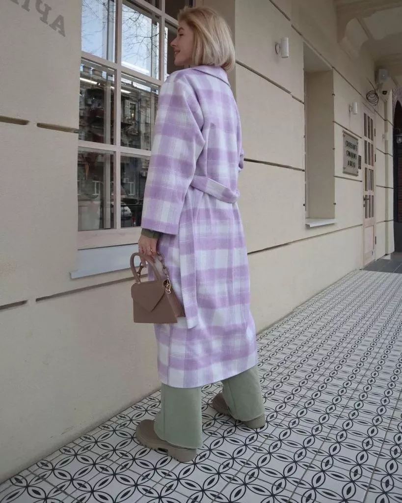 А для розслабленого луку вихідного дня пригляньте пальто на запах у клітинку фіолетового кольору зі спущеною лінією плеча. Одягайте під нього улюблений трикотажний костюм, що складається з брюк-палаццо та сорочки вільного крою. Доповніть образ зручними черевиками-челсі та маленькою сумкою-клатчем.