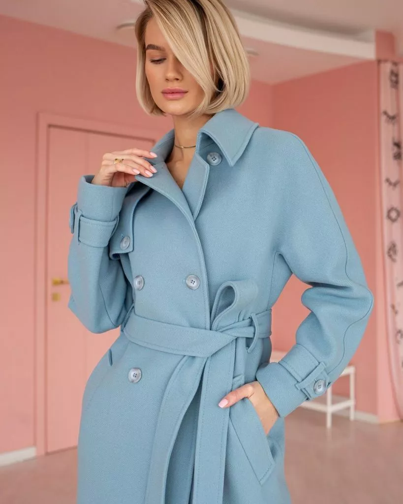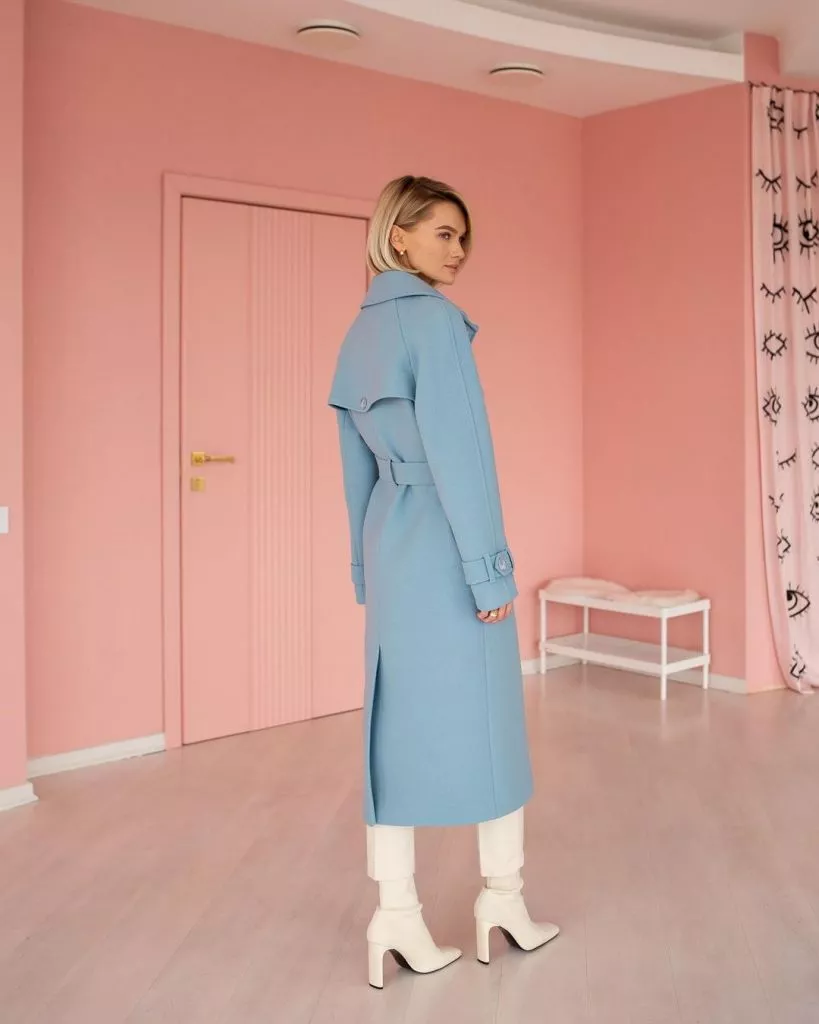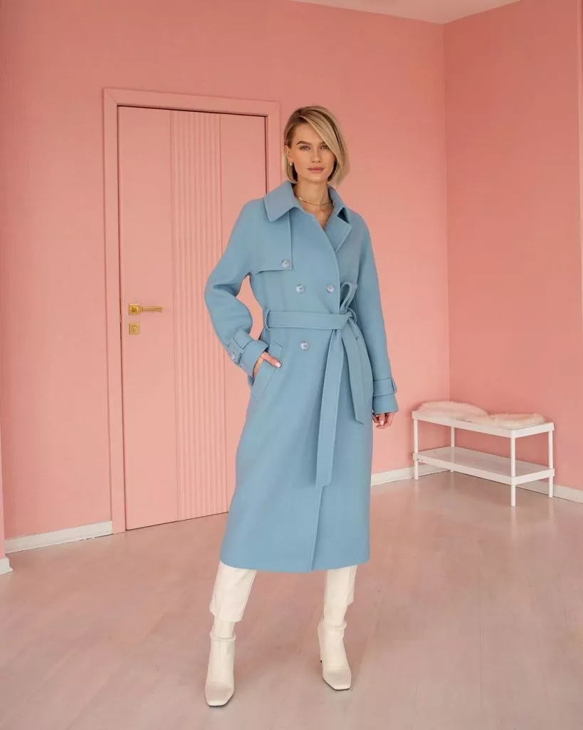 Для створення ділового образу підберіть пальто ніжно-блакитного відтінку з кокеткою та поясом. Надягайте під нього білу блузу, укорочені штани зі стрілками та ботильйони в тон. Доповнить лук брендова сумка та непомітні прикраси.