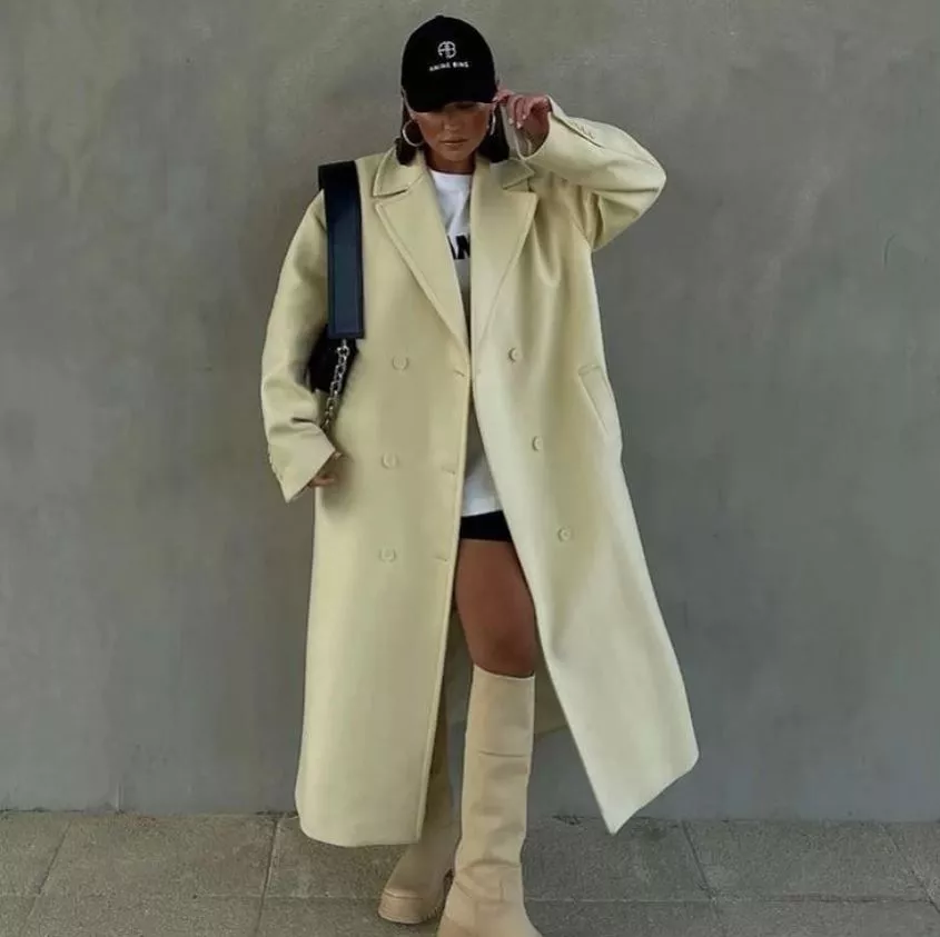 Для повсякденного луку підійде довге оверсайз-пальто ніжно-лимонного кольору. Носити його можна як із класичними діловими костюмами, так і з джинсами та міні-спідницями. Одягайте коротку спідницю, світшот і високі чоботи-труби. Доповніть образ пальтом пастельного кольору, мініатюрною сумкою і чорною кепкою.