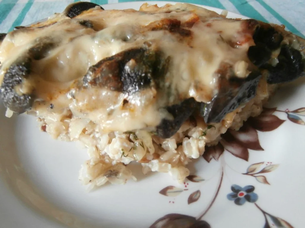 2. Змішати рис з половиною сиру, натертого на крупній тертці. На форму, змащену маслом, викласти половину рису, а після цього гриби з цибулею, потім рис, що залишився. Посипати зверху другою половиною тертого сиру і прикрасити декількома грибами. Випікати 15 хвилин.