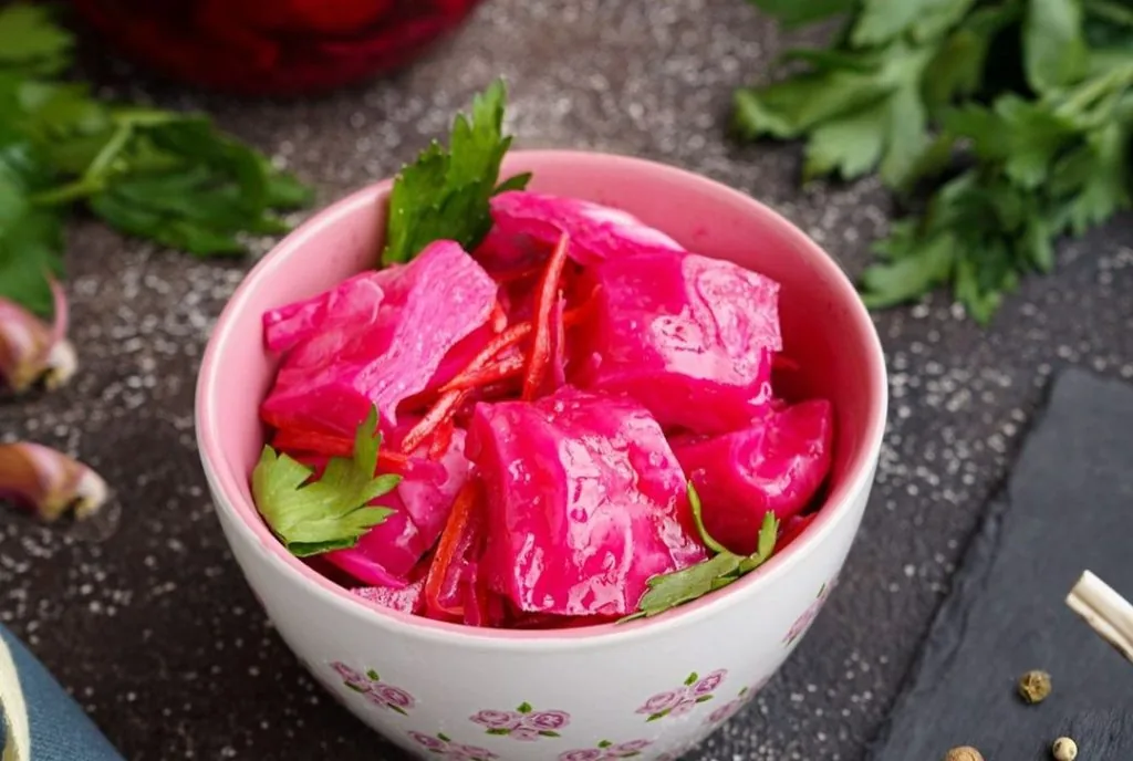 Ароматна капуста Пелюстка – дуже смачна заготовка, яка готується з додаванням буряка. Закуска має незвичайний рожевий колір і схожа на пелюстки троянди. На будь-якому святковому столі її розмітають за хвилини. Буряк надає овочу насиченого солодкуватого смаку, а маринад додає прянощів.