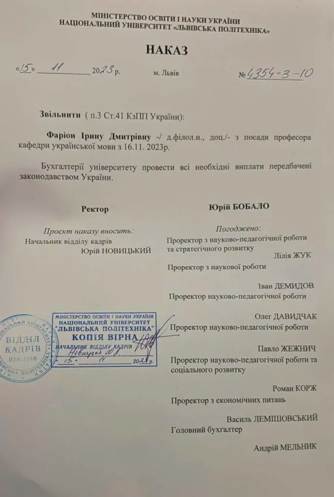 Про це повідомив Міністр освіти і науки Оксен Лісовий. Він зазначив, що відповідний наказ про звільнення Фаріон зі Львівської політехніки уже підписав ректор.