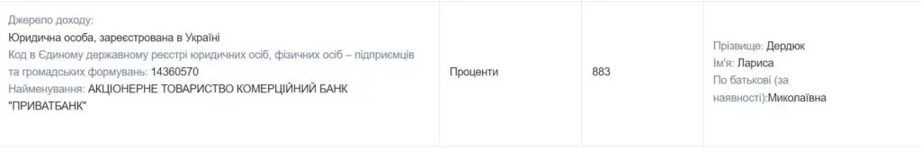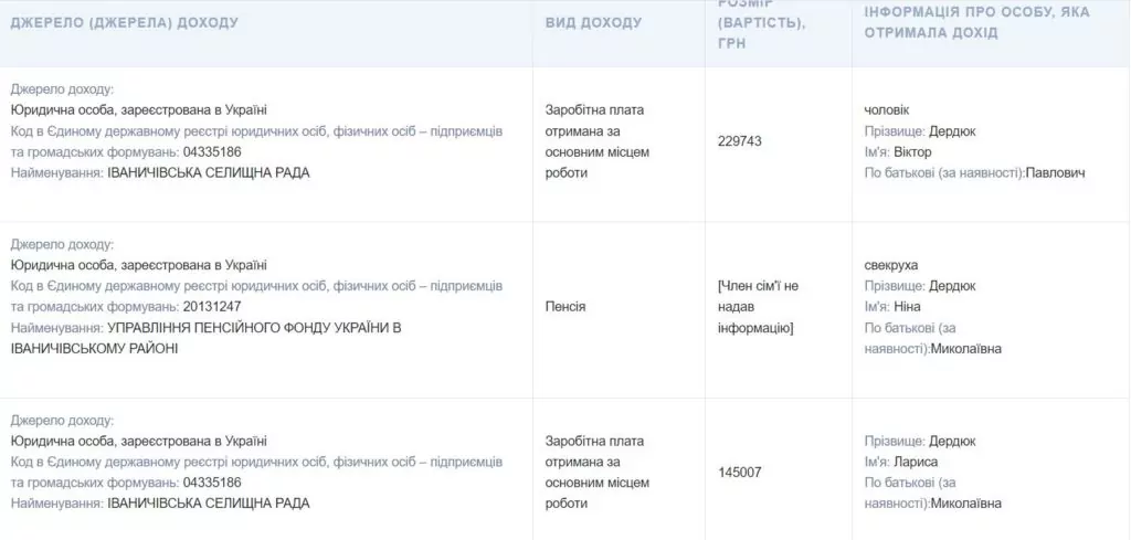 Серед доходів своєї свекрухи Лариса Дердюк зазначила пенсію, але не повідомила скільки саме коштів та отримала.