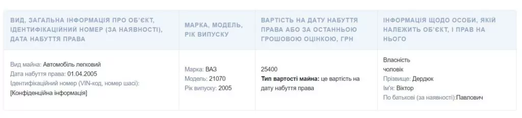 Також на чоловіка Лариси Дердюк зареєстрований автомобіль ВАЗ 21070 2005 року випуску. Його Віктор Дердюк придбав у квітні 2005 року за 25 тисяч 400 гривень.
