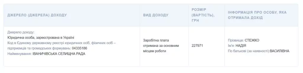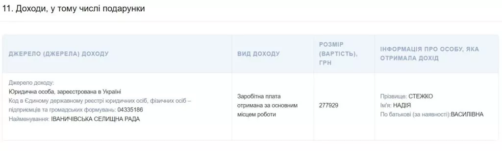 Тож у декларації за 2021 рік Надія вказала зарплату на двох посадах. Так за цей рік вона отримала 67 тисяч 910 гривень заробітку в апараті селищної ради та 81 тисячу 211 гривень, виконуючи обов’язки старости. В 2022 році Надія Стежко заробила 277 тисяч 971 гривню. Це орієнтовно 18 тисяч 998 гривень в місяць.