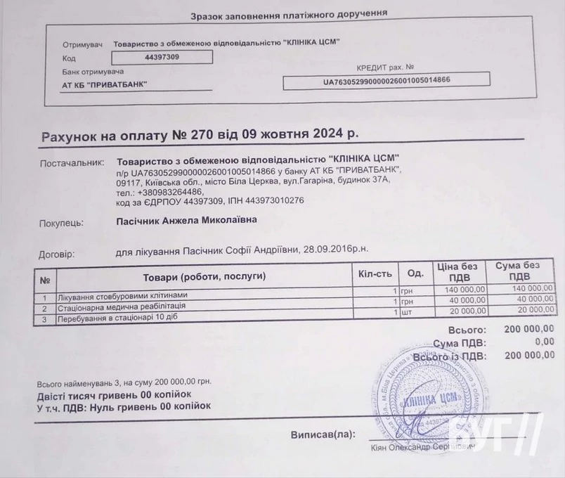 “Наше спасіння — це введення стовбурових клітин, яке підтримує активність мозкової діяльності, щоб при токсикації в Софії не було ще більшого відкату в розумовій діяльності. І це не призвело до ще важчої стадії аутизму. Для підтримки спинного і головного мозку їй потрібно провести ще три процедури введення стовбурових клітин, які необхідно робити кожні три місяці. Вартість кожної процедури – 200 тисяч гривень. За три потрібно 600 тисяч гривень.