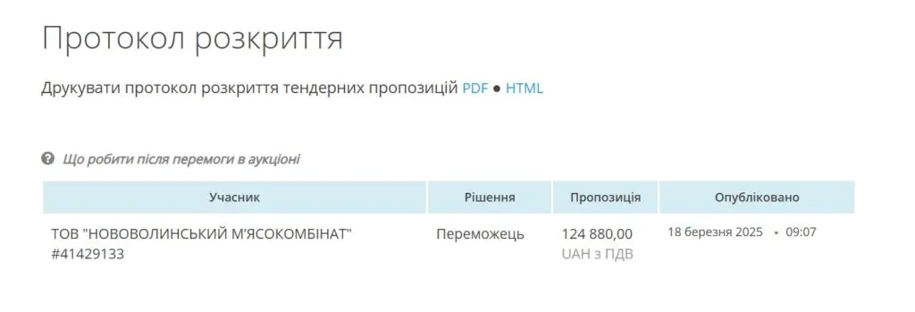 Ще дві тендерні закупівлі лікарня оголосила 13-го березня. Цього разу вирішили провести аукціони. І вже через кілька днів – зранку 18-го березня на одному із аукціонів вияснилось, що 400 кілограм сардельок зі свинини й яловичини вищого сорту медзакладу постачатиме ТОВ “Нововолинський м’ясокомбінат”, який запропонував нижчу ціну продукції – 124 тисячі 880 гривень і обігнав свого конкурента – ПП «Сузір’я», яке пропонувало 135 тисяч 200 гривень.