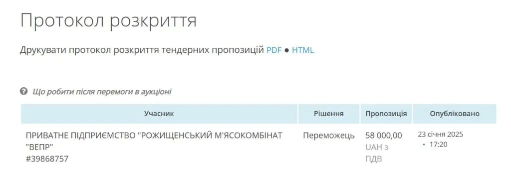 Наступний тендер, який провела Іваничівська багатопрофільна лікарня щодо закупівлі харчів, відбувся 23-го січня. Цього разу медзаклад придбав 100 кілограм тримінгу 20/80 свинного та 200 кілограм мякушевого напівфабрикату зі свинини 1 категорії. Цю продукцію закупили у приватного підприємства «Рожищенський м’ясокомбінат «Вепр» за 58 тисяч гривень.