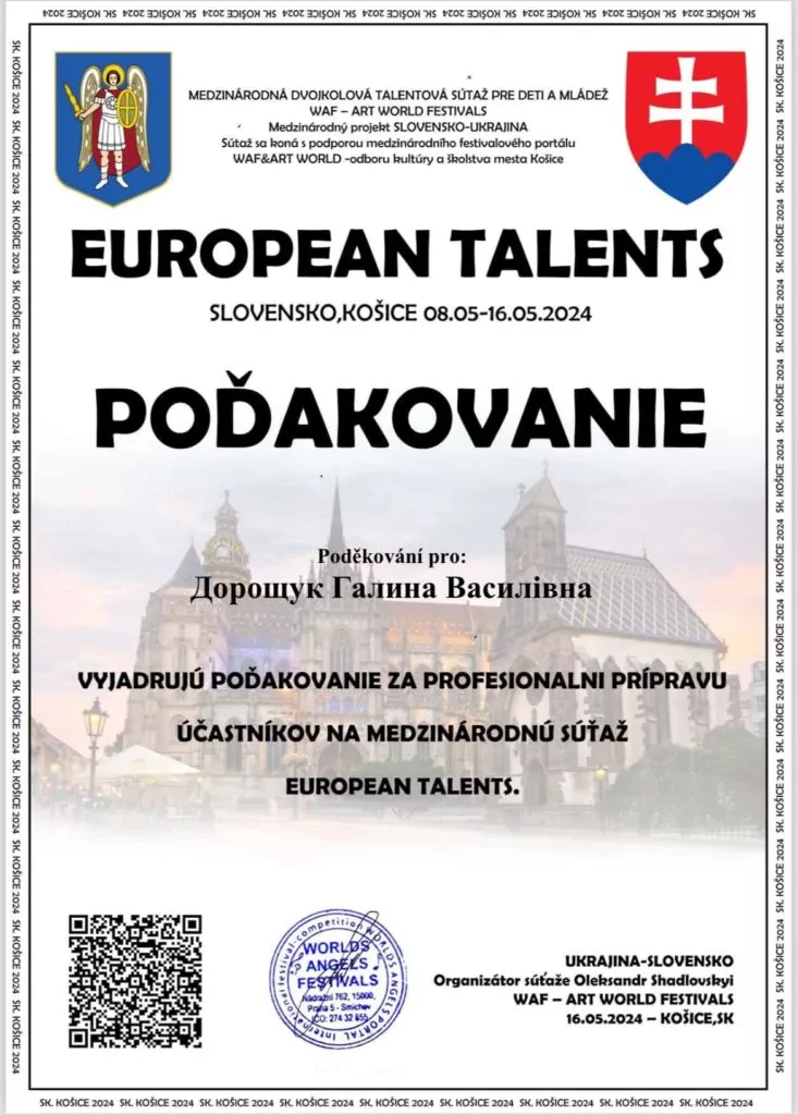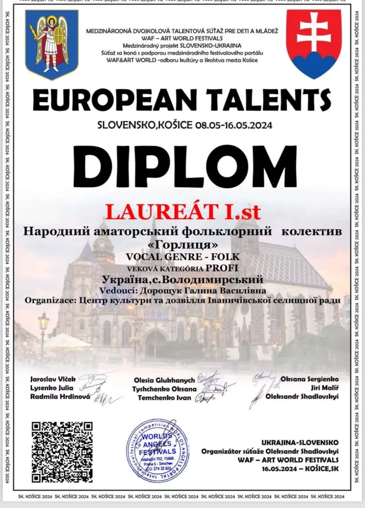 Народний аматорський фольклорний колектив «Горлиця» за участь у Міжнародному двотуровому благодійному фестивалі-конкурсі мистецтв «EUROPEAN TALENTS» отримав чергову нагороду – Диплом лауреата І ступеня.