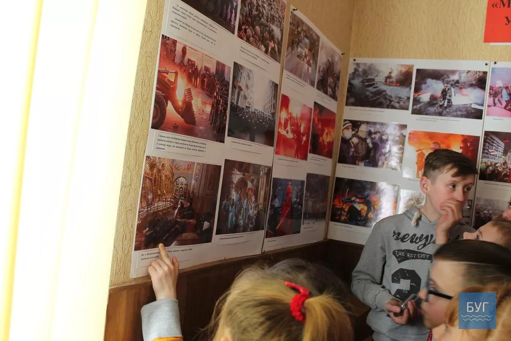 Затим діти переглянули виставку приурочену Героям Небесної Сотні. Її підготувала завідувач музеєм Лариса Куль. Вона розповіла про події відображені на фотографіях, про спогади учасників Революції Гідності, розповіла про свої враження від відвідування Майдану у різні часи, як і у революційні дні так і через певні періоди. Про це розповідають фотографії та різні речі, які знаходяться в музеї: книжки, газети, каска будівельника, яку використовували як захист. На фотографіях наші земляки на Майдані під час Революції гідності.