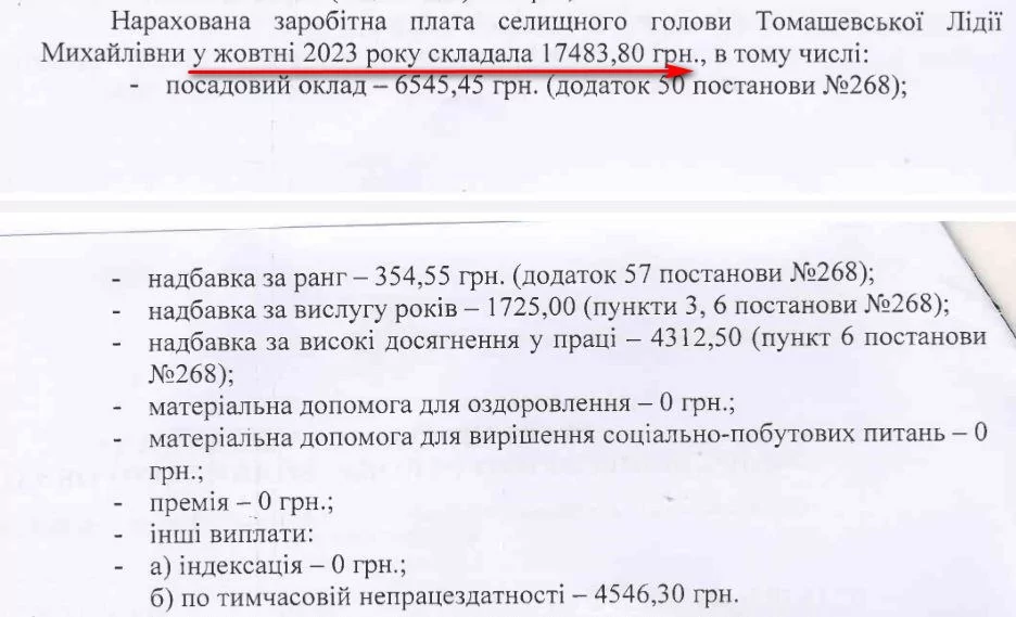 Відповідно до отриманої інформації, очільниця громади Лідія Томашевська за два місяці отримала 41 тисячу 203 гривні. Зокрема, середньомісячна виплата чиновниці склала близько 20 тисяч гривень. Крім посадового окладу їй виплачували надбавки за ранг, вислугу років та високі досягнення у праці. Найцікавіше те, що щомісячно Томашевська отримує майже 8 тисяч гривень надбавки за високі досягнення в роботі.