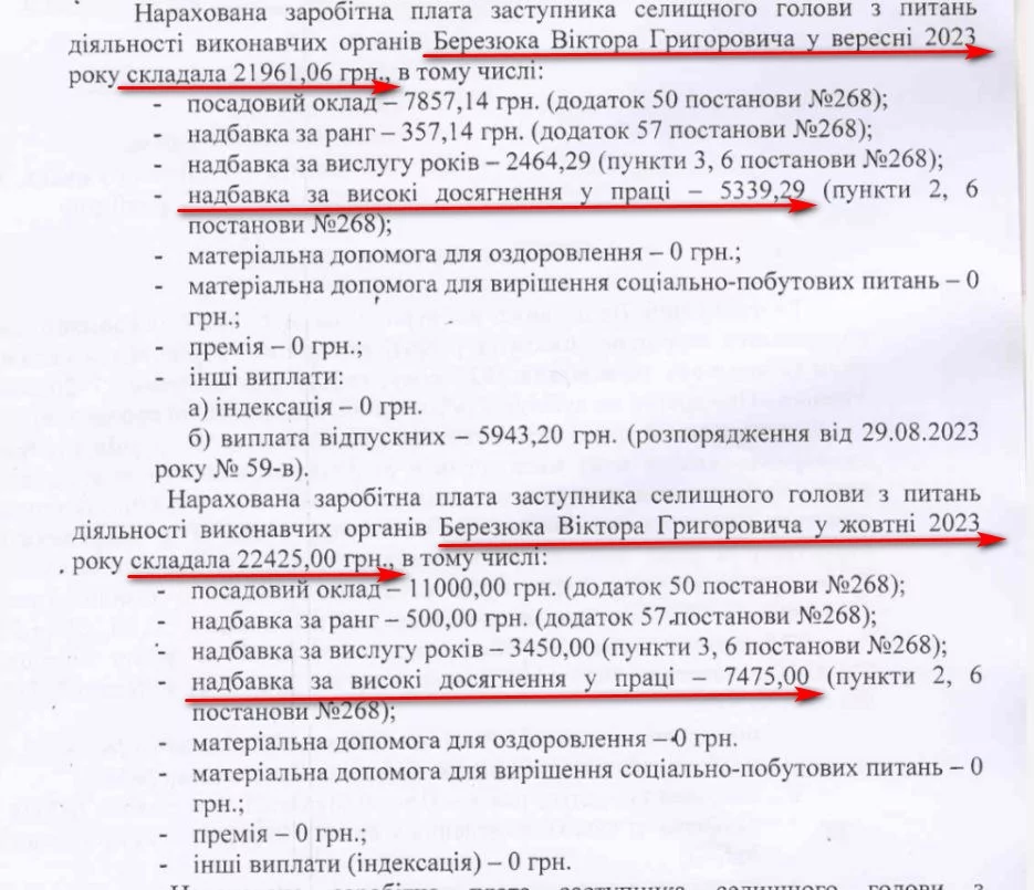 Заступнику селищної голови з питань діяльності виконавчих органів Віктору Березюку за два місяці нарахували 44 тисячі 386 гривень заробітної плати. Як і селищна голова, чиновник додатково отримував надбавки, у тому числі й за хорошу роботу – по 5-7 щомісячно. Також у вересні Березюку дали майже 6 тисяч гривень відпускних.