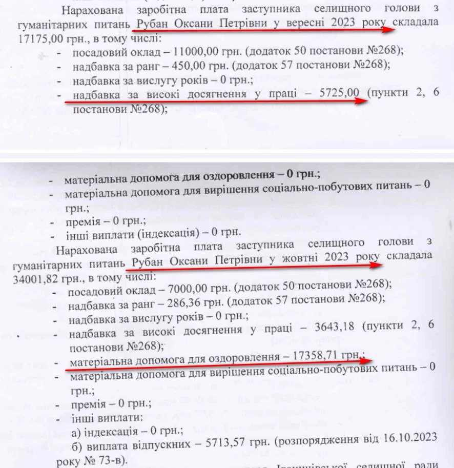 Заступниця з гуманітарних питань Оксана Рубан за вересень-жовтень отримала 51 тисячу 177 гривень. Отримала чиновниця й надбавку за високі досягнення в праці – понад 5,7 тисяч гривень щомісяця. Найвідданішій соратниці Томашевської, як її називають в громаді, нарахували ще 17 тисяч 359 гривень матеріальної допомоги на оздоровлення та 5 тисяч 714 гривень відпускних.