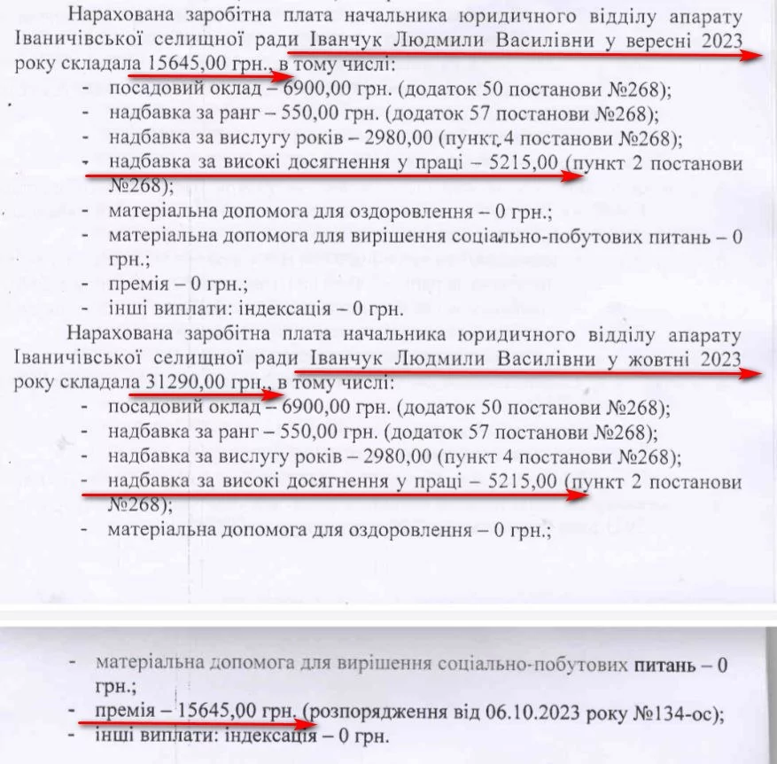 І якщо попереднім посадовцям Томашевська виплачувала надбавки за високі досягнення в праці, то начальниці юридичного відділу Людмилі Іванчук в жовтні відкрито нарахували премію – 15 тисяч 645 гривень. Загалом за два місяці юристка отримала 46 тисяч 935 гривень. Щомісяця виплачують їй і надбавки за високі досягнення в праці – по 5 тисяч 215 гривень.