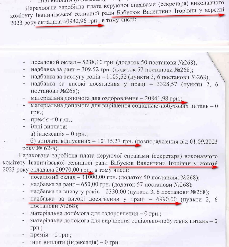 Найбільше у вересні-жовтні виплатили керуючій справами виконкому Валентині Бабусюк. За два місяці їй нарахували 61 тисячу 913 гривень заробітної плати, включно з різними надбавками. Близько 7 тисяч гривень надбавки очільниці виконкому щомісячно дають за високі досягнення в праці. У вересні Валентина Бабусюк отримала матеріальну допомогу для оздоровлення – 20 тисяч 842 гривні та 10 тисяч 115 гривень відпускних.