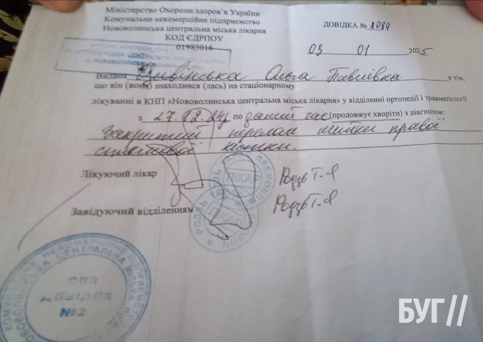 Із проханням до небайдужих відгукнутися на біду до БУГу звернулася родичка жінки. За її словами, наразі пані Ольга перебуває у важкому стані в Нововолинській центральній міській лікарні.