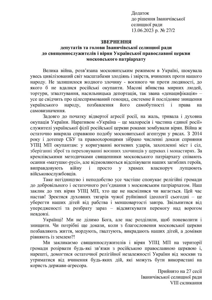 Депутати Іваничівської селищної ради на сесії 13-го червня ухвалили звернення до священнослужителів та парафіян Української православної церкви московського патріархату, що діють на території громади.
