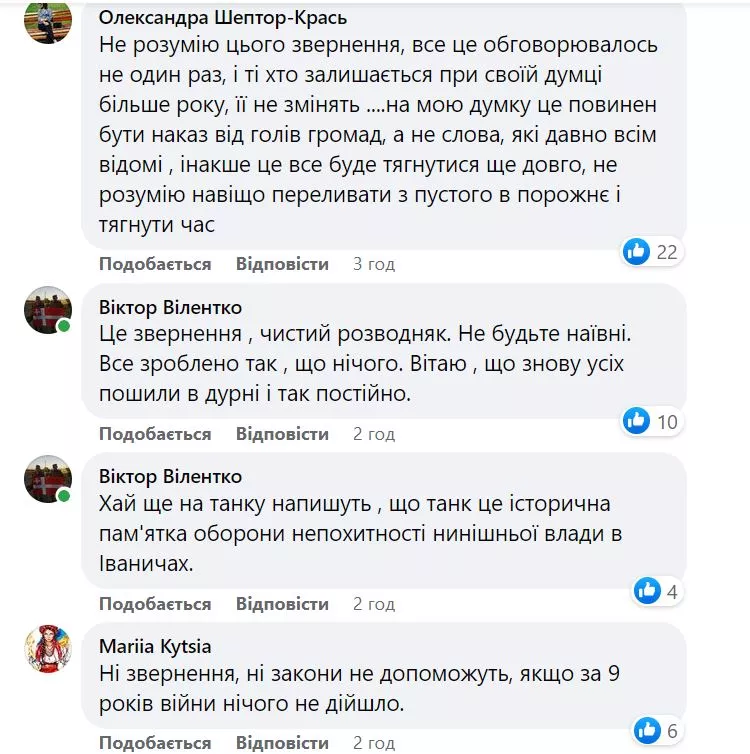 А Віктор Вілентко, який наразі перебуває на передовій, взагалі назвав прийняте звернення “чистим розводняком”. Він переконаний, що місцевих мешканців знову пошили в дурні.