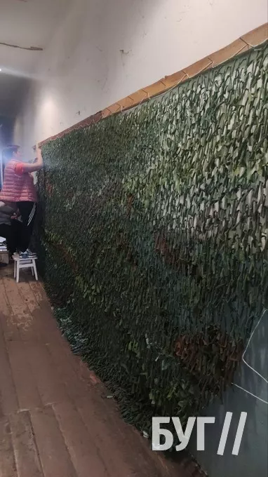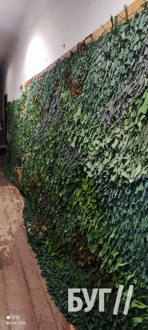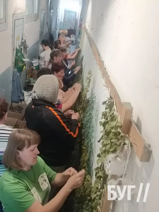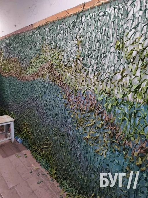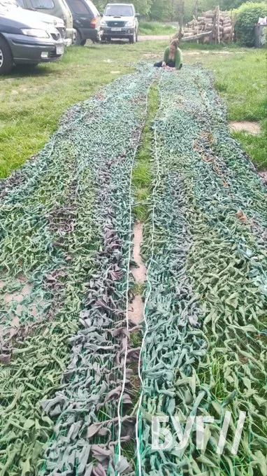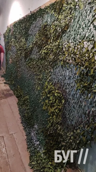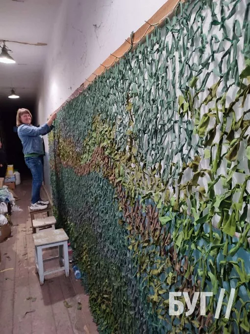 Роботу розподілили між собою так, щоб швидше і вправніше її виконувати. Одні нарізають клаптики тканини, інші в’яжуть їх на сітку. З часом з’явилася проблема з тканинами потрібного зеленого кольору. Однак винахідливі волонтерки знайшли вихід і з цієї ситуації: тканини інших кольорів вирішили фарбувати. Для цього купують спеціальну фарбу. І координаторка Наталія Мартинюк вдома замочує в цій фарбі тканину інших кольорів, а потім висушує.