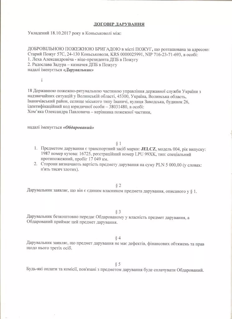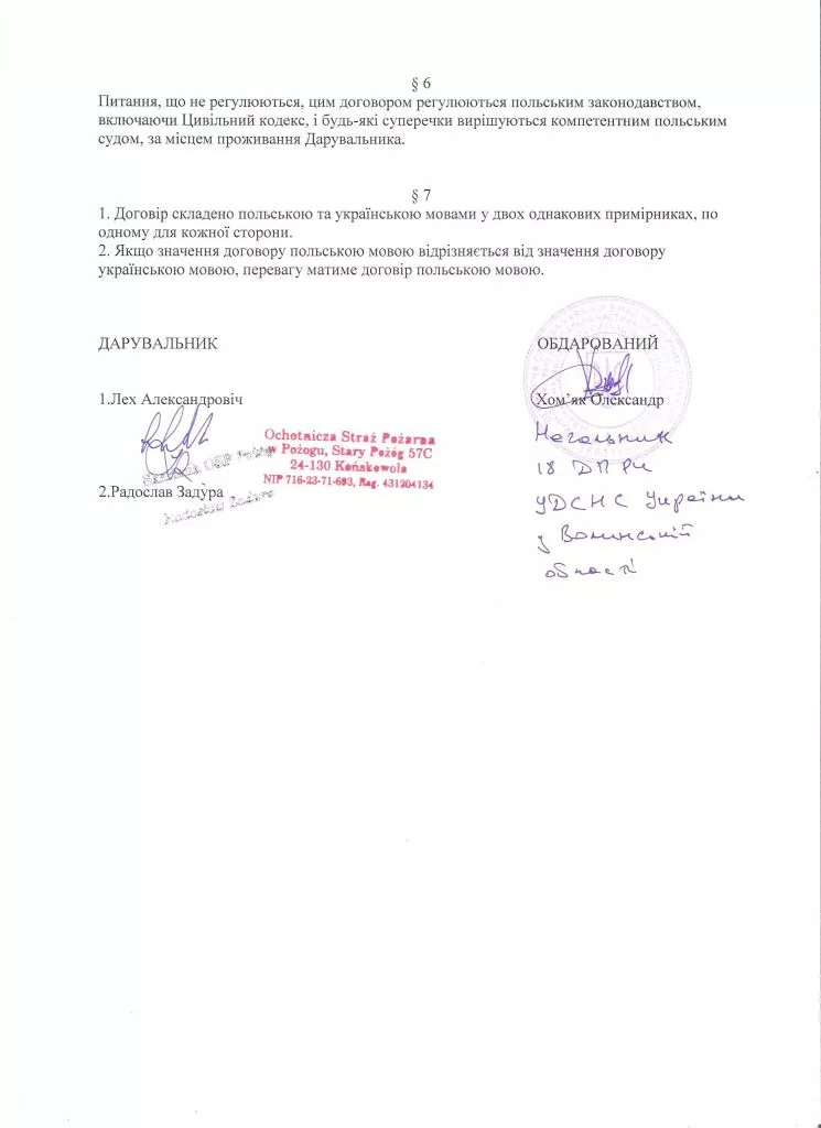 – Договір був підписаний нашим Олександром Хом’яком, у розпорядження його частини надходить цей автомобіль і начальником пожежної частини з польської сторони Радославом Задурою. Так що юридично це вже наш автомобіль. З польської сторони наші партнери оформили всі документи і сплатили всі митні податки, які вимагаються. Тепер, відповідно до цього договору, ми підготували всі документи на Міністерство соціальної політики України, щоб нашу пожежну частину включили у Єдиний Державний Реєстр, як отримувача гуманітарної допомоги. Тоді ми зможемо переправити цей автомобіль в Іваничі і зареєструвати відповідно до наших вимог, – повідомив Микола Пасевич.