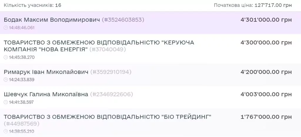 Однак інші чотири учасники були найзавзятішими і в результаті торгів підняли ціну до 4 мільйонів гривень. Так, Галина Шевчук запропонувала за приміщення ЦНАПу 4 мільйони 3 тисячі гривень, Іван Римарук – 4 мільйони 200 тисяч гривень, а ТзОВ “Керуюча компанія “Нова енергія” – 4 мільйони 300 тисяч гривень.