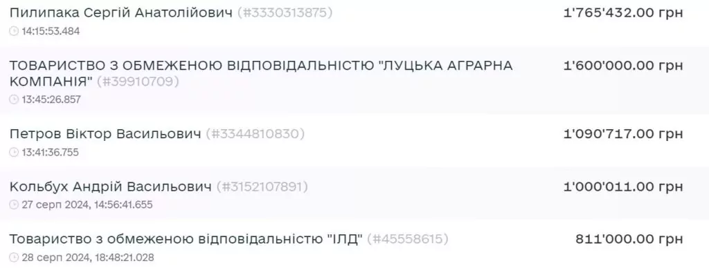 Відтак остаточні ціни від учасників аукціону були різними. Зокрема, Павло Оганісян хотів придбати будівлю за 130 тисяч гривень, Марія Сивохіп – за 167 тисяч 717 гривень, Олександр Рудь – за 205 тисяч гривень, Олена Кислюк – за 350 тисяч 556 гривень, ТзОВ “2Х2 ФІНАНС” – за 460 тисяч гривень, Дмитро Карабан – за 503 тисячі 900 гривень, ТзОВ “ІЛД” – за 811 тисяч гривень, Андрій Кольбух – за один мільйон гривень, Віктор Петров – за один мільйон 90 тисяч 717 гривень, ТзОВ “Луцька аграрна компанія” – за один мільйон 600 тисяч гривень, Сергій Пилипака – за мільйон 765 тисяч 432 гривні та ТзОВ “БІО ТРЕЙДИНГ” – за один мільйон 767 тисяч гривень.