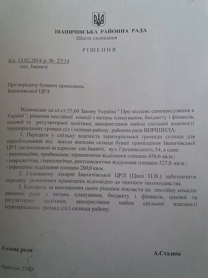 1.Вважати такими, що втратили чинність рішення районної ради від 13.02.2014 р. №27/14 «Про передачу бувших приміщень Іваничівської ЦРЛ», №18/14 від 10.07.2013 року «Про звернення начальника Іваничівського РВ УМВС України у Волинській області щодо виділення приміщення під житло», №20/12 від 03.10.2013 року «Про внесення змін і доповнень до рішення районної ради від 10.07.2013р. №18/14 «Про звернення начальника Іваничівського РВ УМВС України у Волинській області щодо виділення приміщення під житло», №24/7 від 23.12.2013р. «Про звернення Іваничівського районного суду щодо виділення приміщення під житло».