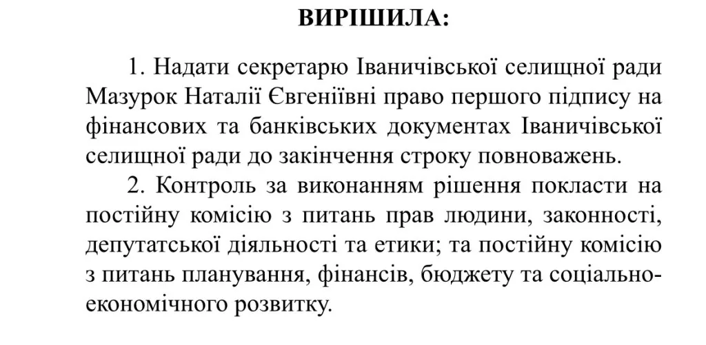 27 листопада депутати оперативно скликали позачергову сесію та проголосували за передачу права першого підпису секретарю ради Наталії Мазурок. Вона вже дала попередню згоду підписати всі необхідні документи та вивести громаду з кризи.