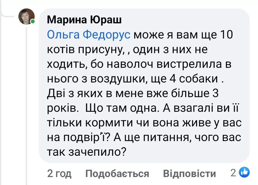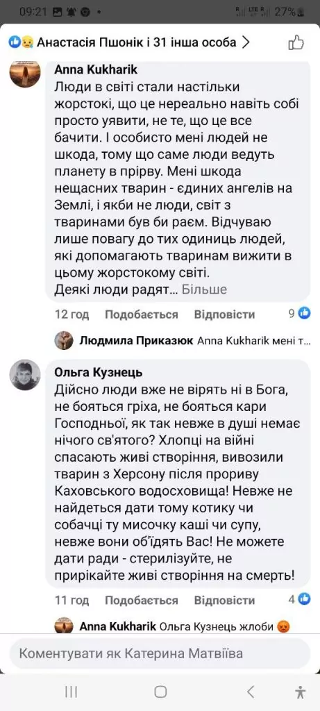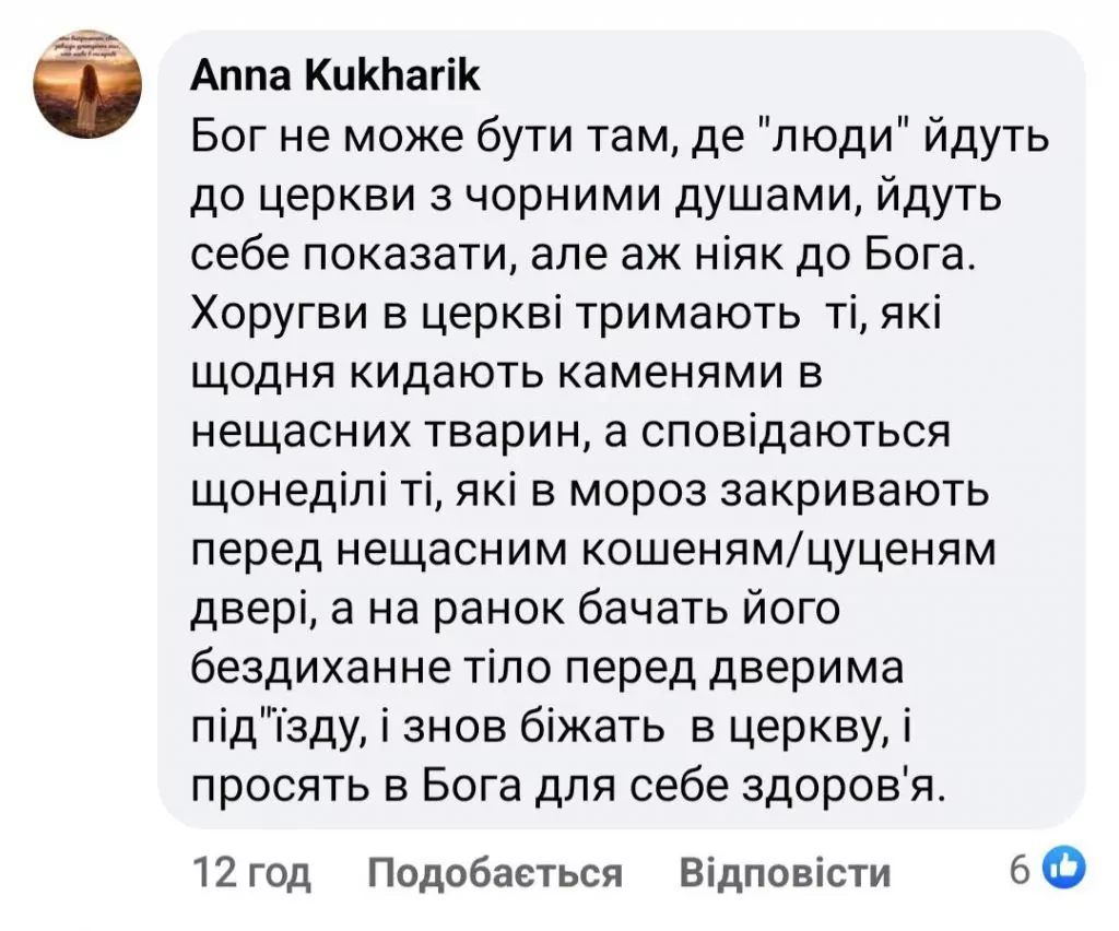 “Дійсно люди вже не вірять ні в Бога, не бояться гріха, не бояться кари Господньої, як так невже в душі немає нічого святого? Хлопці на війні спасають живі створіння, вивозили тварин з Херсону після прориву Каховського водосховища! Невже не найдеться дати тому котику чи собачці ту мисочку каші, чи супу, невже вони об’їдять Вас! Не можете дати ради – стерилізуйте, не прирікайте живі створіння на смерть!”, – написала вона.