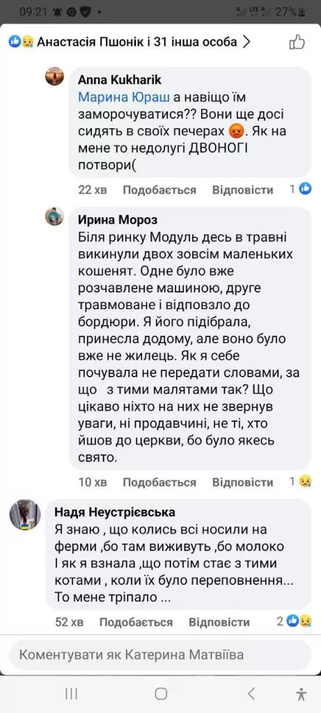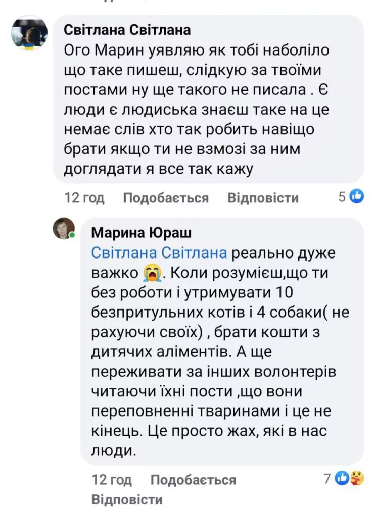 “Вчора знову підкинули двох кошенят чорна дівчинка і сірий хлопчик. А я й так маю 10 котів і ще 4 собаки. Це тільки бездомні. Один котик не ходить, бо хтось вистрелив в нього з “воздушки”. Це важко. Тим більше, що я зараз без роботи. Тому, аби утримувати 10 безпритульних котів і 4 собаки, не рахуючи своїх, доводиться брати кошти з дитячих аліментів. Просто мені жаль цих тваринок. У чому вони винні? Вони ж такі беззахисні. Це просто жах, які в нас люди.
