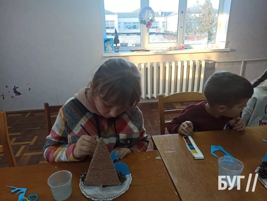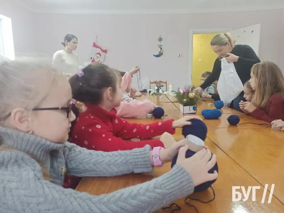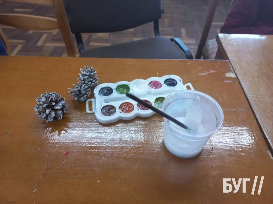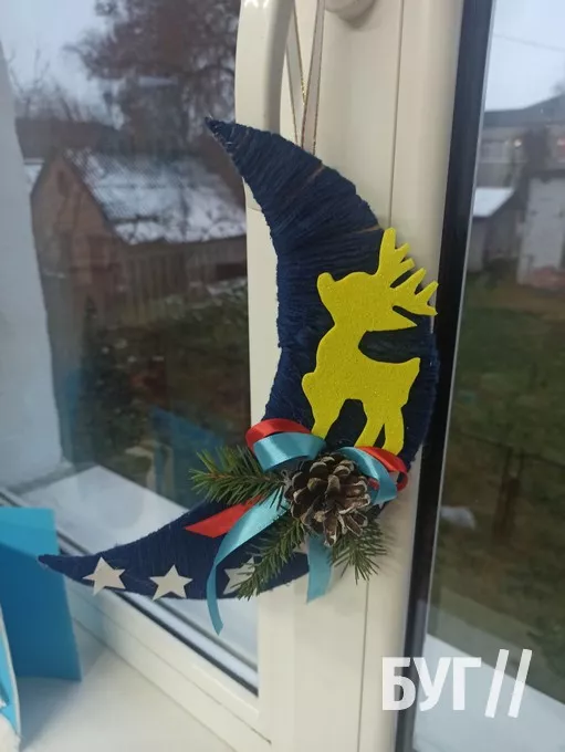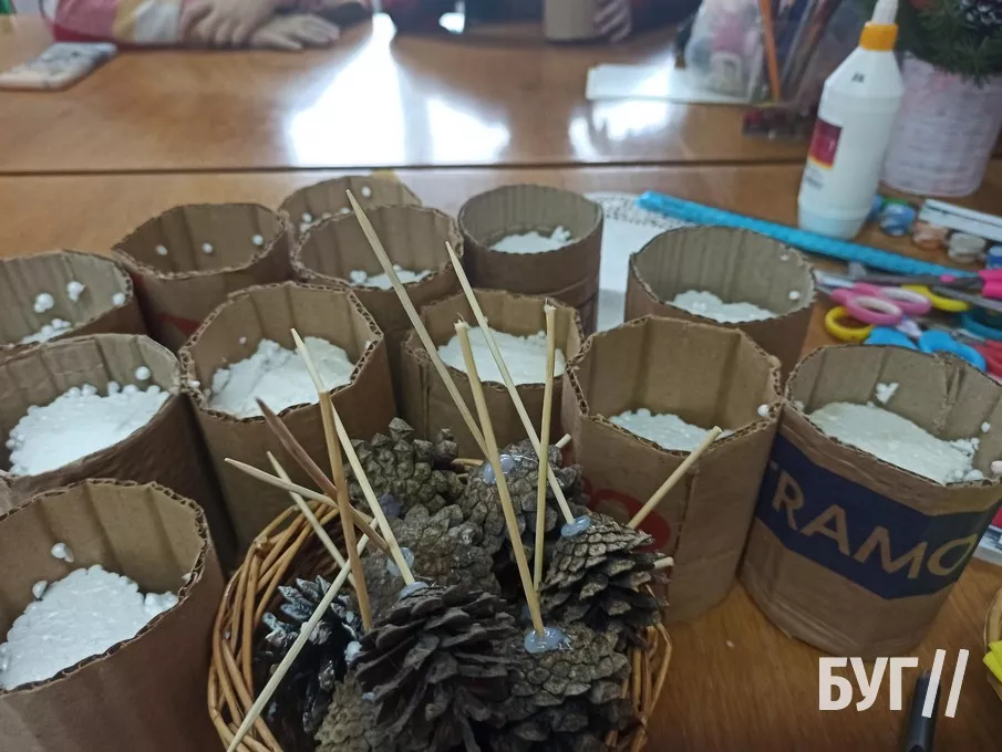 Другого дня дітлахи виготовляли новорічну підвіску. Вони вирізали фігурку оленя, зірочки та інші візерунки, опісля намотувати на картонну основу нитки і декілька разів перемотували її, а насамкінець розфарбовували шишки та декорували свої підвіски.