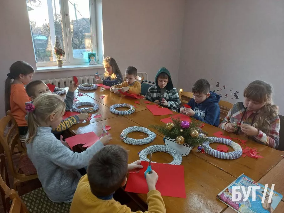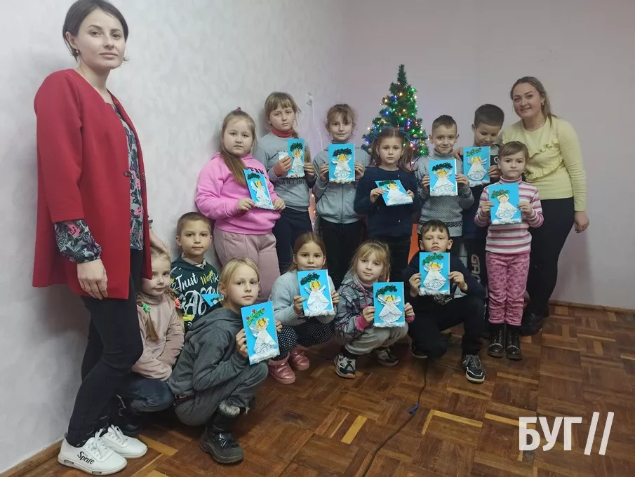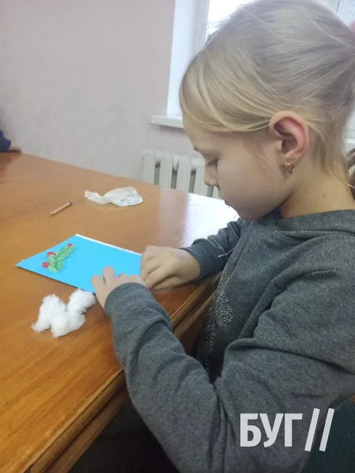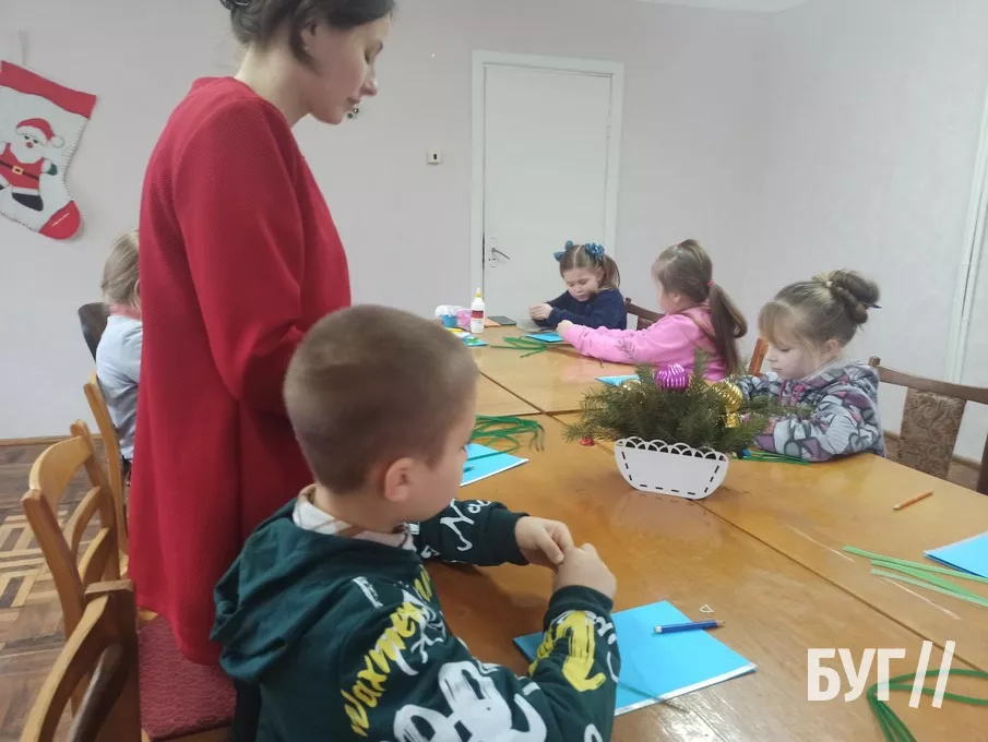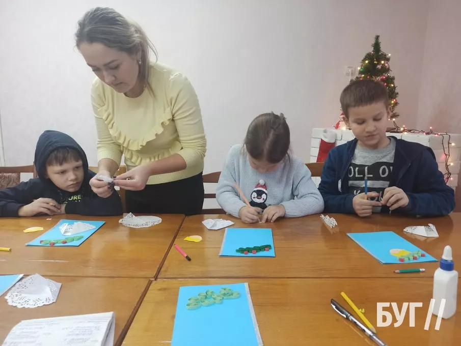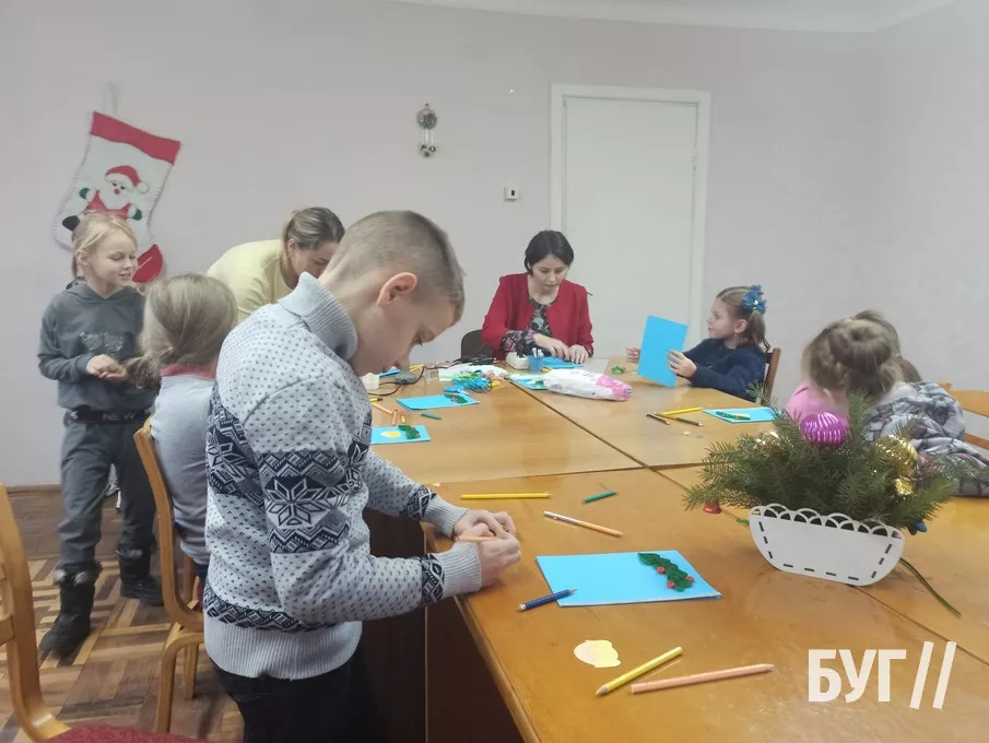 Так, у перший день роботи Майстерні діти дружно працювали над оздобленням святкової листівки “Святий Миколай”. Кожен з них готував окремі деталі, скріплював їх клеєм, а потім розмальовував.