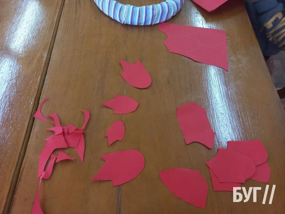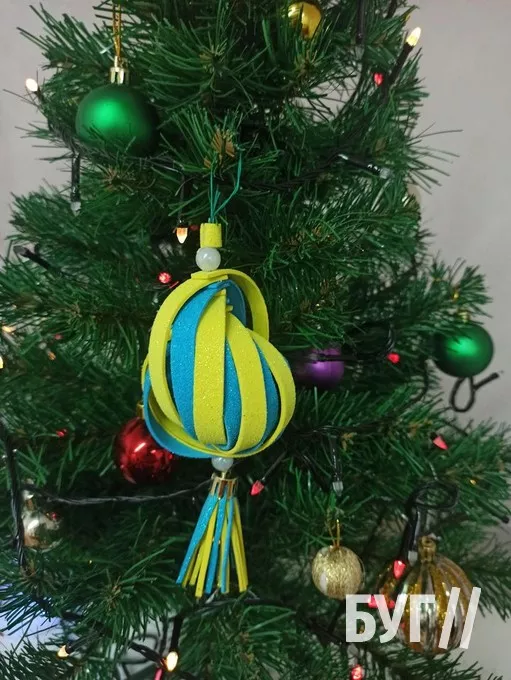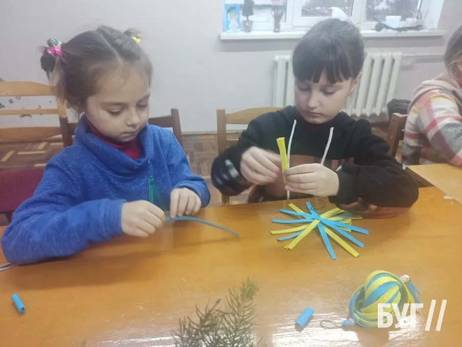 На п’ятому занятті у творчій майстерні діти виготовляли ялинкову прикрасу в патріотичних кольорах. Найбільше часу зайняв процес скріплення смужок, адже потрібно було їх акуратно і правильно з’єднати, щоб іграшка мала гарний вигляд. Але усі терпляче працювали і в результаті їм вдалося зробити гарні іграшки, які стануть окрасою новорічної ялинки.