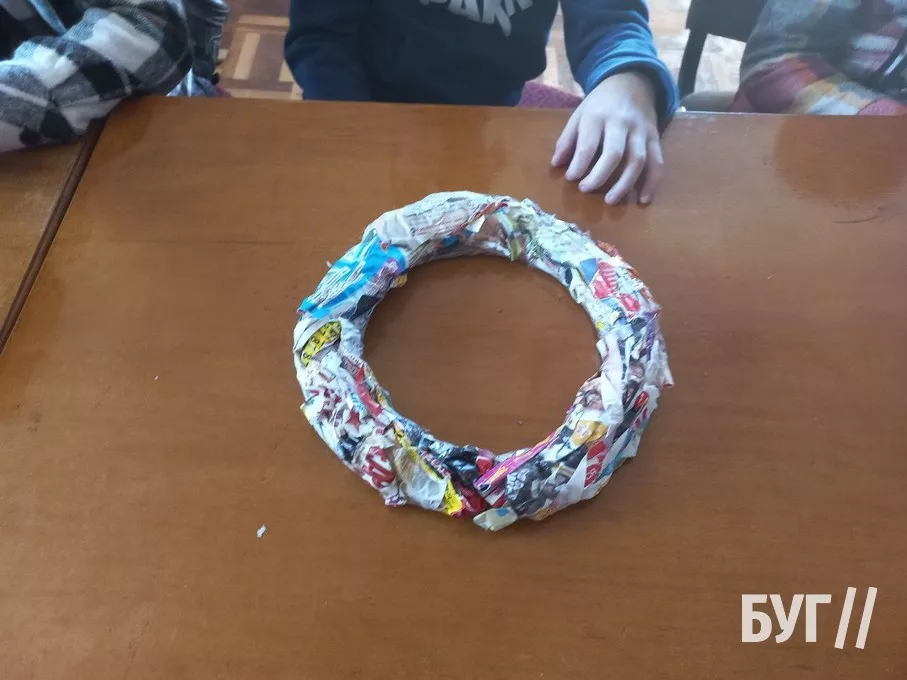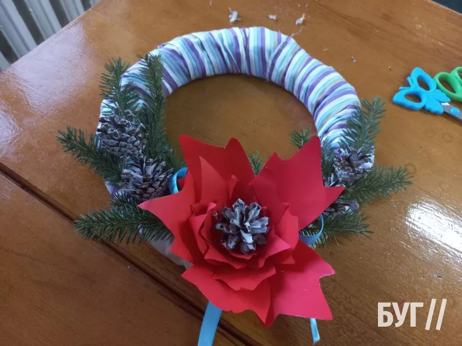 Наступного дня відвідувачі Майстерні виготовляли ще одну святкову прикрасу – різдвяний вінок, який чіпляють на двері. У вмілих і старанних рученятах старі журнали, картон з коробок та шишки перетворилися на гарну і яскраву святкову річ. Хоча й довелося багато попрацювати, всі діти залишилися задоволені.