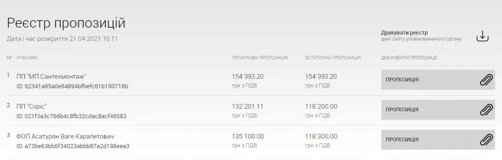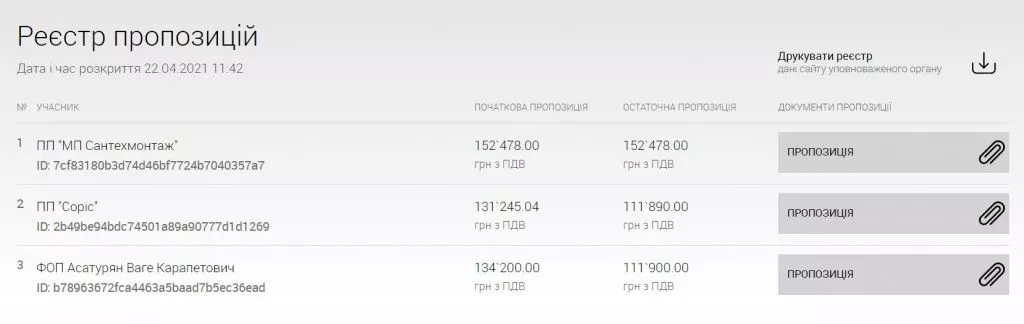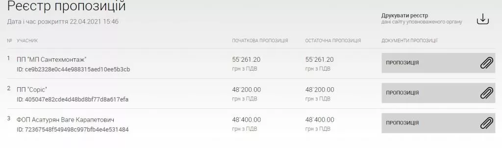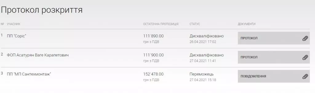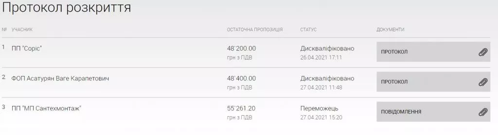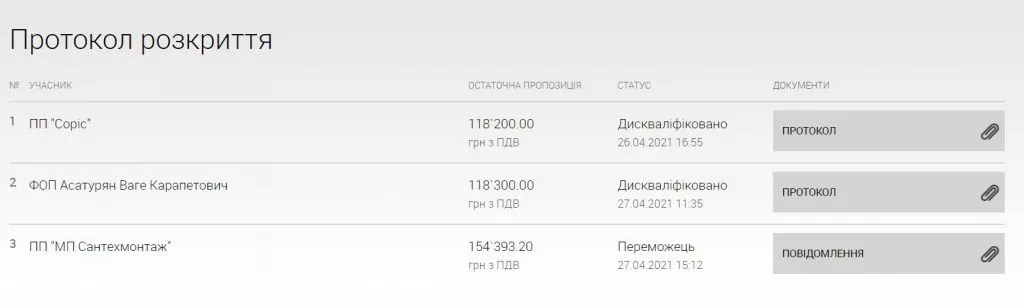 Що цікаво – ця фірма пропонувала найдорожчу ціну ремонтних робіт, однак всерівно виграла торги. Це сталося через те, що двох інших претендентів – ПП «Соріс» та ФОП Асатурян Ваге Карапетович, які представили значно дешевші пропозиції, чомусь дискваліфікували. І фірма Коптюка, лишившись єдиним учасником тендеру, перемогла.