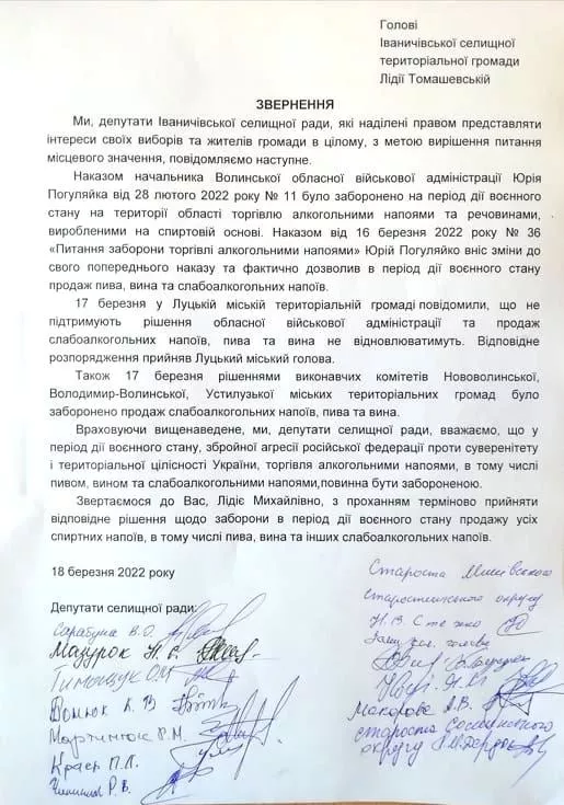 Нагадаємо, голова Іваничівської селищної ради відмовлялася продовжувати заборону на продаж будь-якого алкоголю на території громади. На засідання виконкому навіть винесли проєкт рішення “Про заборону продажу алкогольних напоїв та речовин, вироблених на спиртовій основі, включаючи пиво, вино та слабоалкогольні напої, військовослужбовцям, працівникам правоохоронних органів та іншим особам, які виконують завдання із забезпечення національної безпеки і оборони України”, який був копією наказу начальника Волинської обласної військової адміністрації Юрія Погуляйка.