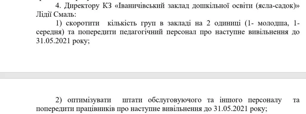 У документі йдеться не лише про закриття груп в дитсадочку, а й про скорочення працівників навчальних закладів громади.