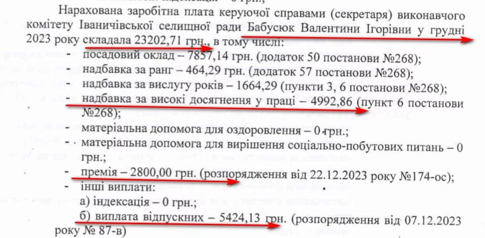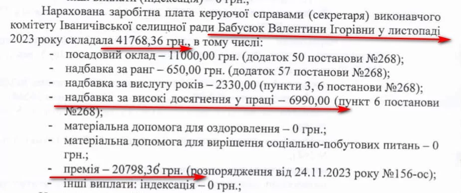 Керуючій справами виконкому Валентині Бабусюк у листопаді-грудні виплатили 64 тисячі 971 гривню зарплати, включно з різними надбавками. Зокрема 11 тисяч 982 гривні очільниці виконкому нарахували за високі досягнення в праці. Ще 20 тисяч 798 гривень дали премії в листопаді та 2 тисячі 800 гривень – в грудні. Окрім цього наприкінці року Валентина Бабусюк отримала 5 тисяч 424 гривні відпускних.