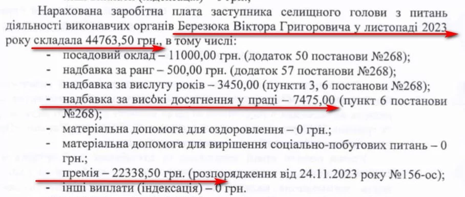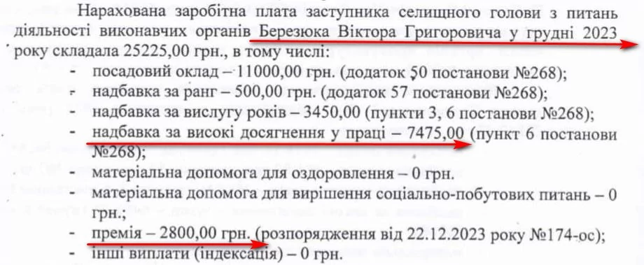 Найбільше за два останні місяці минулого року заробив заступник селищної голови з питань діяльності виконавчих органів Віктор Березюк. За цей час йому нарахували 69 тисяч 988 гривень заробітної плати. Як і селищна голова, чиновник додатково отримував надбавки, у тому числі й за “хорошу роботу” – по 7 тисяч 475 гривень щомісячно. Однак левова частина отриманих тоді коштів – це премія. Так у листопаді Томашевська виписала Березюку 22 тисячі 338 гривень грошової винагороди, ще 2 тисячі 800 гривень премії чиновник отримав в грудні.