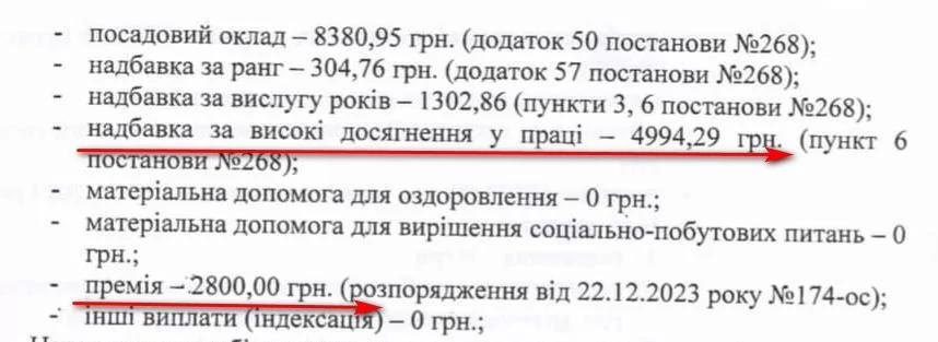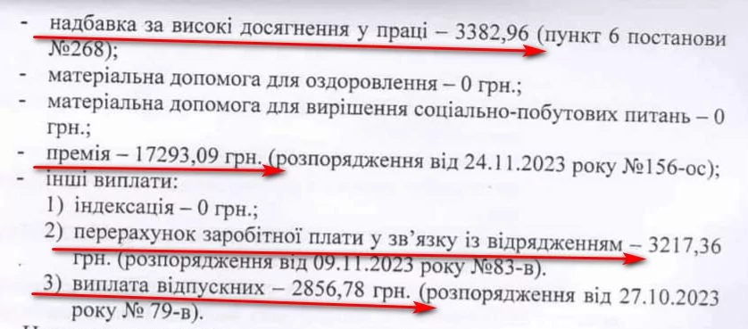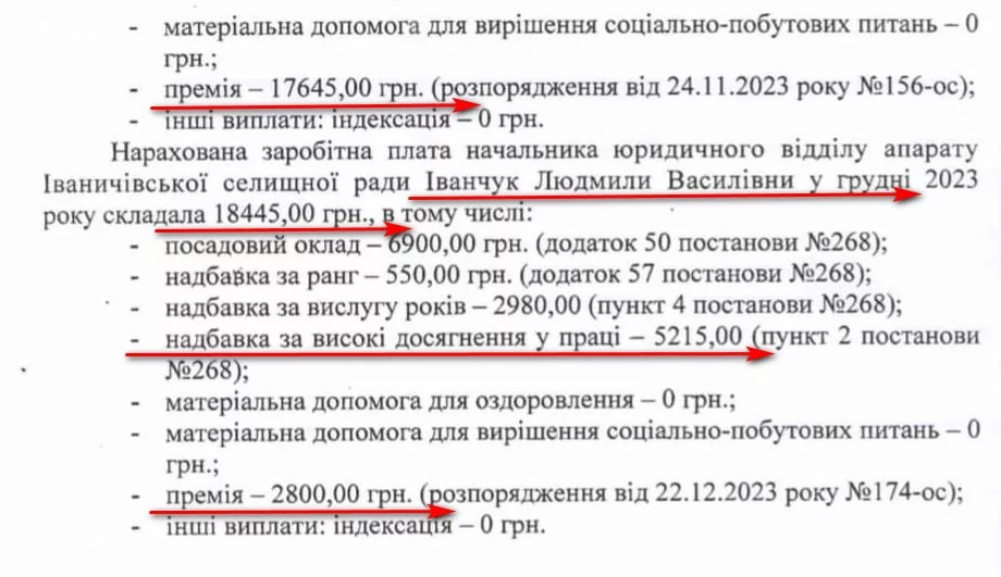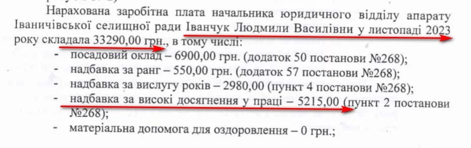 Начальниці юридичного відділу Людмилі Іванчук в листопаді нарахували премію – 17 тисяч 645 гривень. Загалом за два місяці юристка отримала 51 тисячу 735 гривень. Щомісяця виплачують їй і надбавки за високі досягнення в праці – по 5 тисяч 215 гривень.